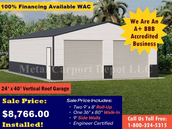 Safeguard And Protect Your Valuable Vehicles And Equipment From The Elements For Years To Come And Save A Huge Amount Of Money With This 24' x 40' Platinum Style Metal Building, 41' Long Roof - 40' Long Frame/Building, with the 29 Gauge Vertical Metal Roof. It is on sale now for just $8,766.00 After Discount, Including Free Delivery and Installation on your Existing Concrete Slab or Level Ground. These Special Prices Will End Soon. So Call Now To Save Big!