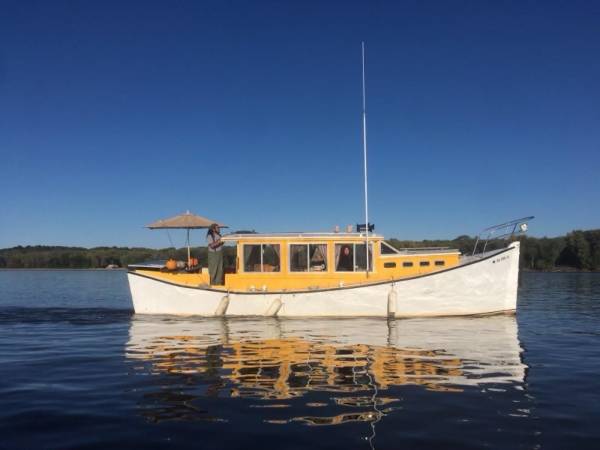 Lines that with turn heads. A Shallow draft that will allow you to beach up lightly, picnic and pull out (less than 2’ draft). Twin outboard Mercury 4 stroke 75hp motors push this ice breaking 7 ton beast. The interior is decked out with wood milled out of reclaimed wood found in Lake Superior. The horns were repurposed from letting an arena know about hockey goals in Duluth to letting folks on shore know something special was passing by.