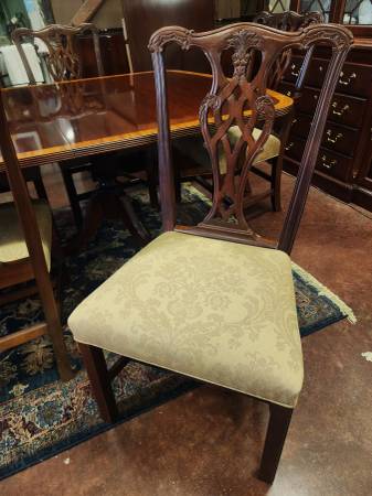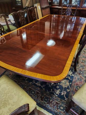 Ethan Allen Georgian Banded Mahogany Double Pedestal Extension Table with 8 Chippendale Cherry Dining Chair Set priced $4,999, NOW $3,999.
