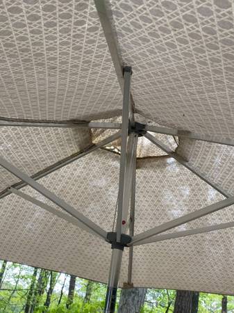 High-quality canvas (with no tears) outdoor umbrella with iron base. Tilts, easy turn open-close, 8.5 foot circumference, 7 foot clear underneath when open.