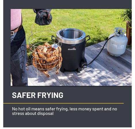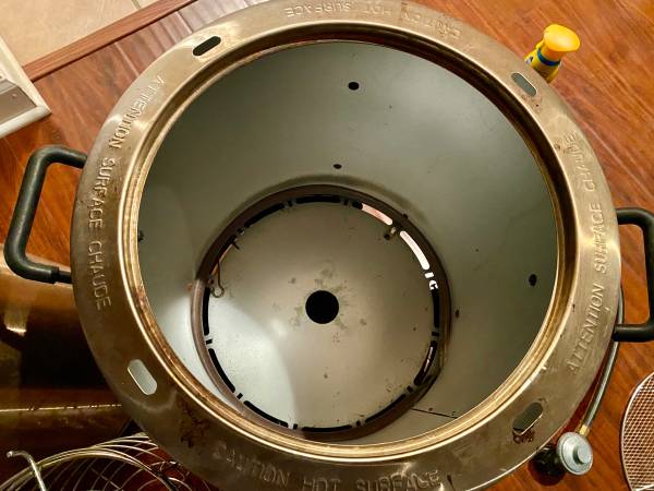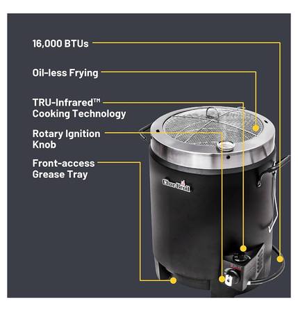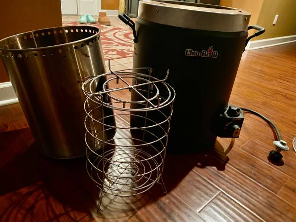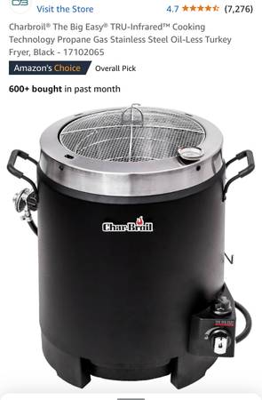 Charbroil, used only a couple of times. For whole Turkeys, Chickens, or Roasts. No need for oil means healthier eating. Comes with cookbook. Just hook up to propane (not provided) and cook. $145 on Amazon plus tax and shipping. Half price at $75. More details in photos, or look up Charbroil “Big Easy.”